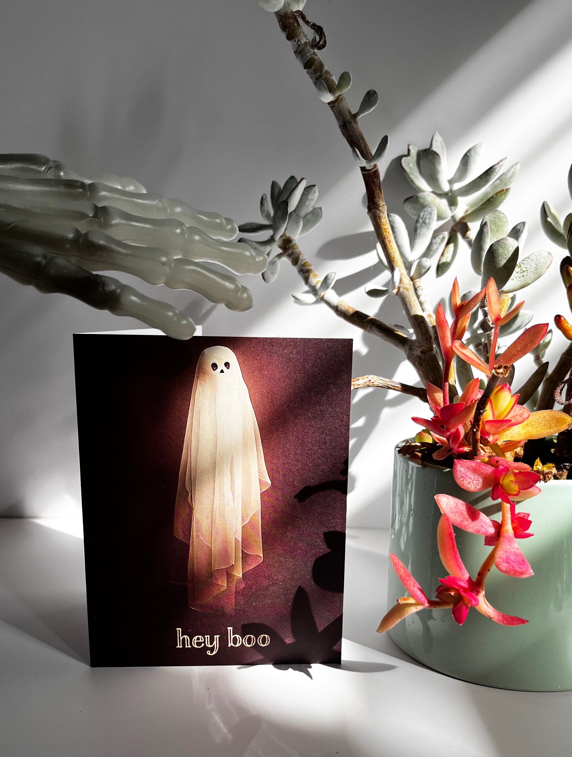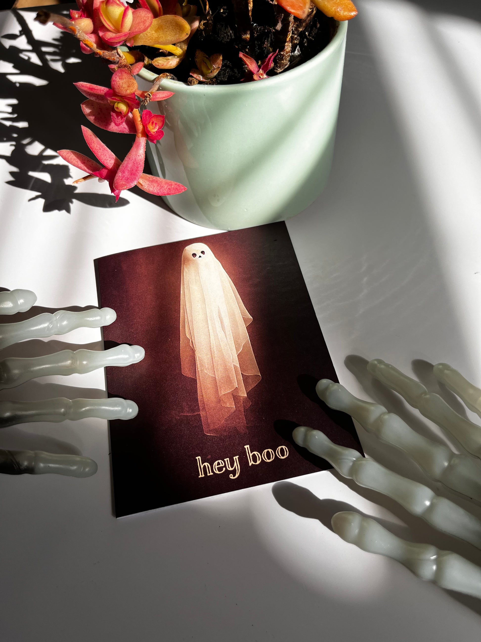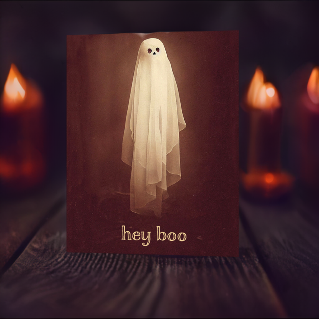 Celebrate your loved ones with this charming Hey Boo Card! This card features a vintage style ghost in a sheet, perfect for weddings, birthdays, and best friends who love spooky season!