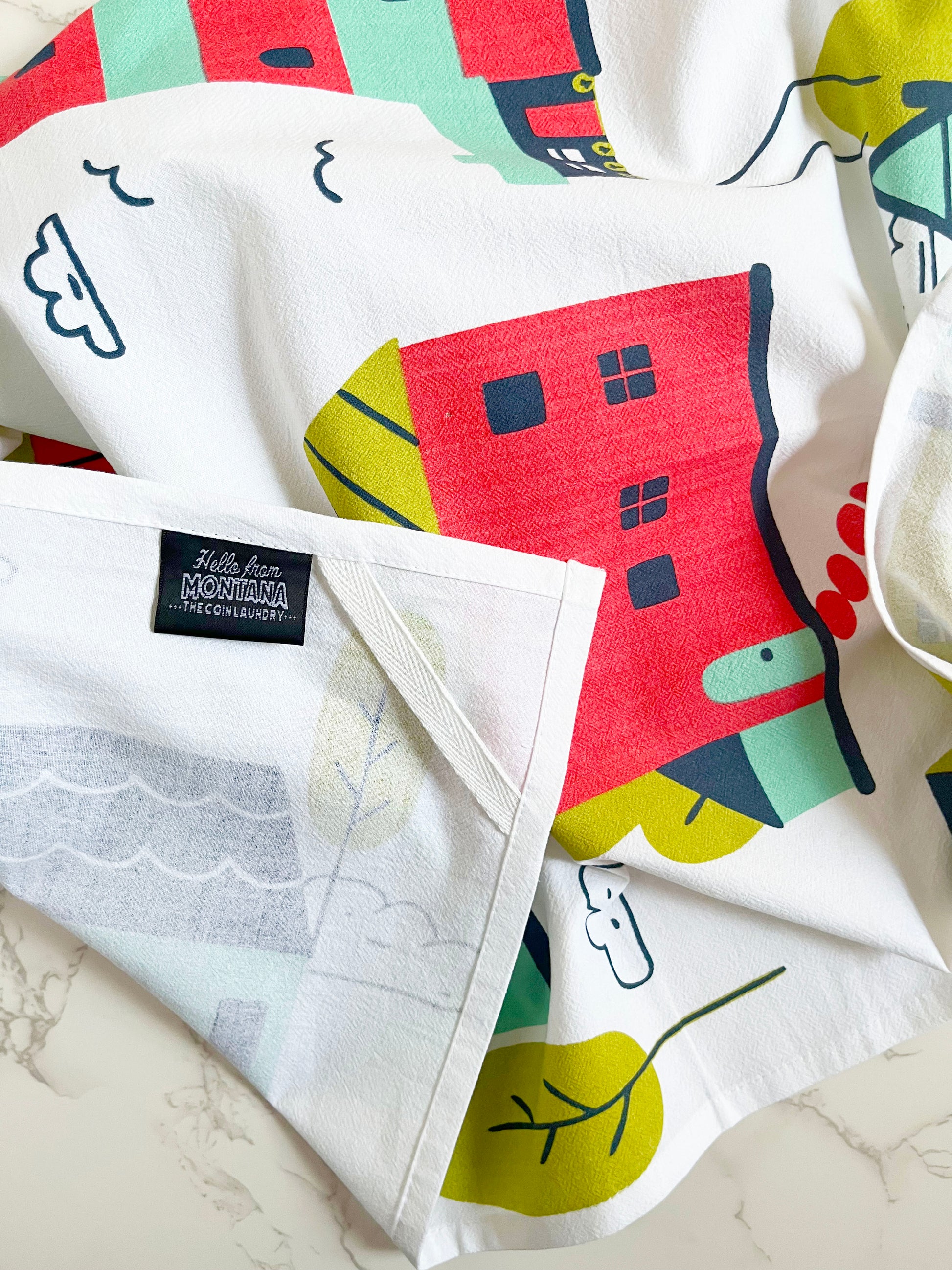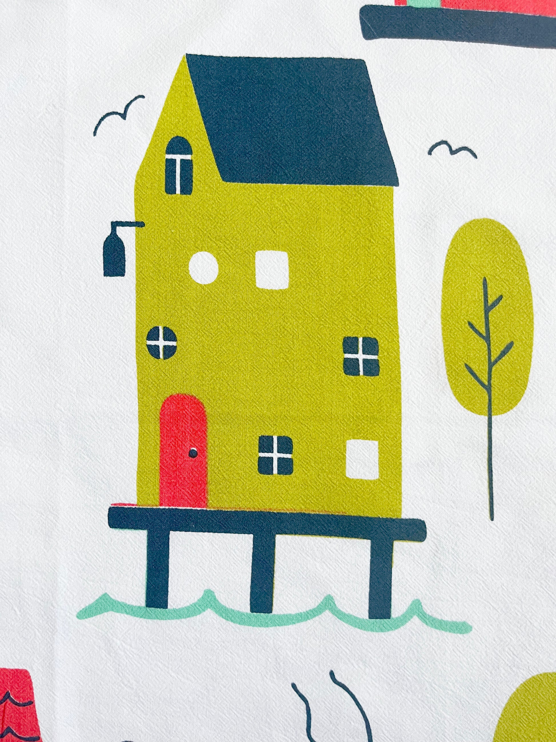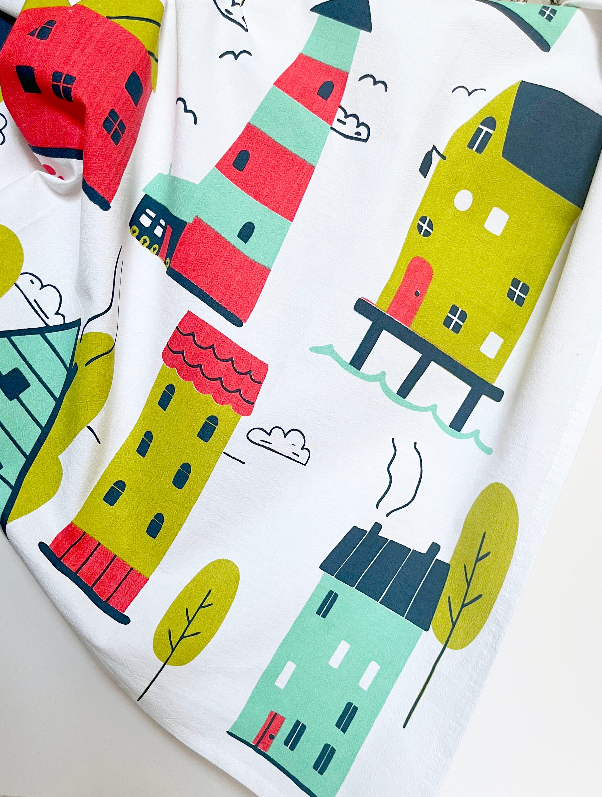 Welcome to our neighborhood! We have A frames, lighthouses, houses by the sea and homes in the trees all in a modern Scandinavian style. Hand illustrated and screen printed with Earth friendly water based inks and solvents. This modern design is oversized and covers the entire 30"x30" towel with abstract red, green and blue homes.