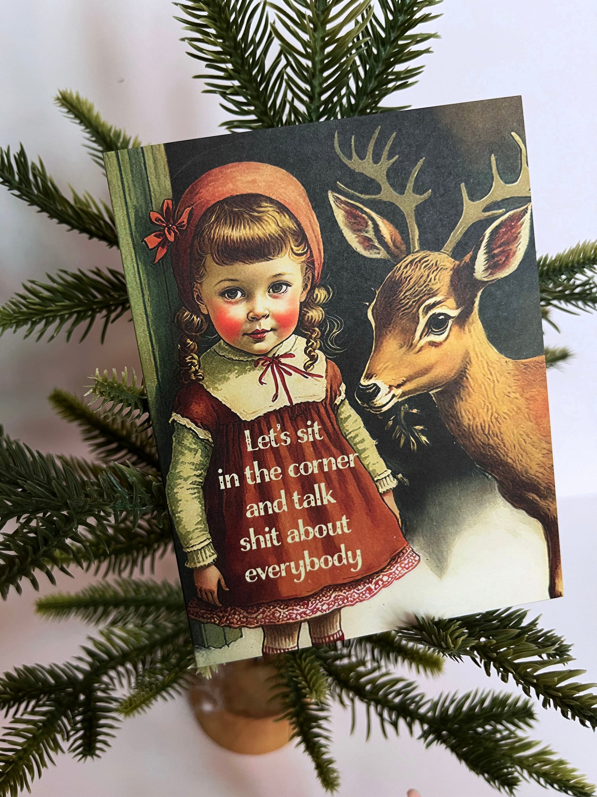 The best spot to post up at a party is with the resident pet and bitchy friend in the corner so you can talk shit all night. This little girl and her deer friend are definitely talking some shit about everyone. They know all the good gossip so grab the box of wine and settle in! This card is blank inside and makes for the best all occasion card for the friend or family member who is always there for you to help you get through every boring party or family gathering. Christmas, Thanksgiving, birthday, wedding, just because, miss you - you can use this card for just about anything!