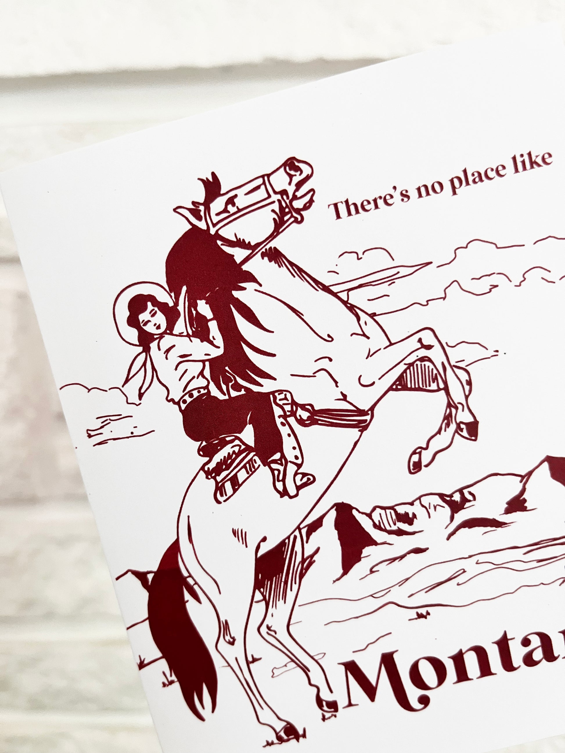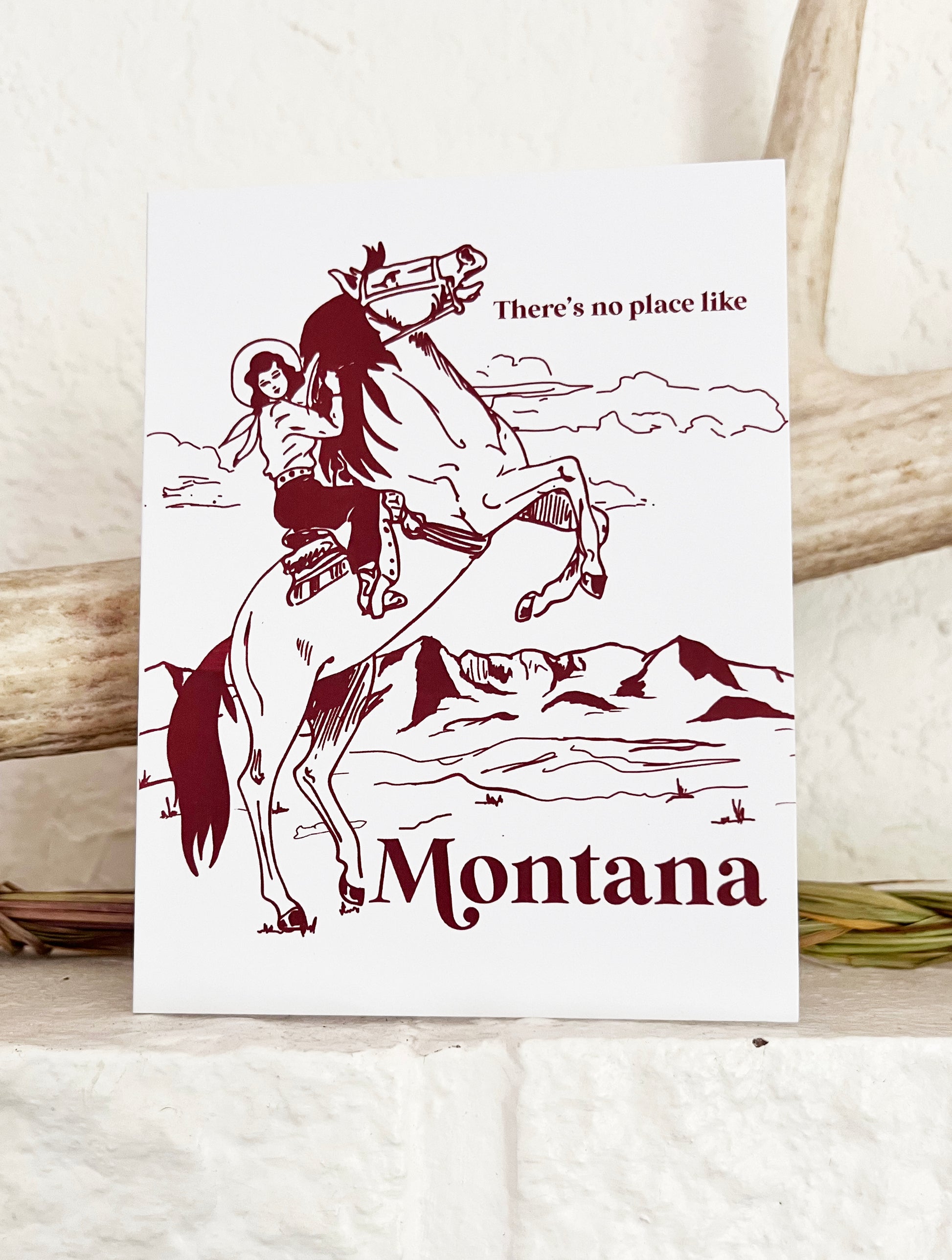 Our adorable retro inspired greeting card is the perfect souvenir to remember your time in the Treasure State! Featuring a sweet vintage style cowgirl on a horse printed in a deep red color this card will make the perfect thank you card, housewarming card or a simple hello. Size A2 card measures 4.75"x5.5" and is blank inside. Printed on 130# paper so cute you'll want to frame it!