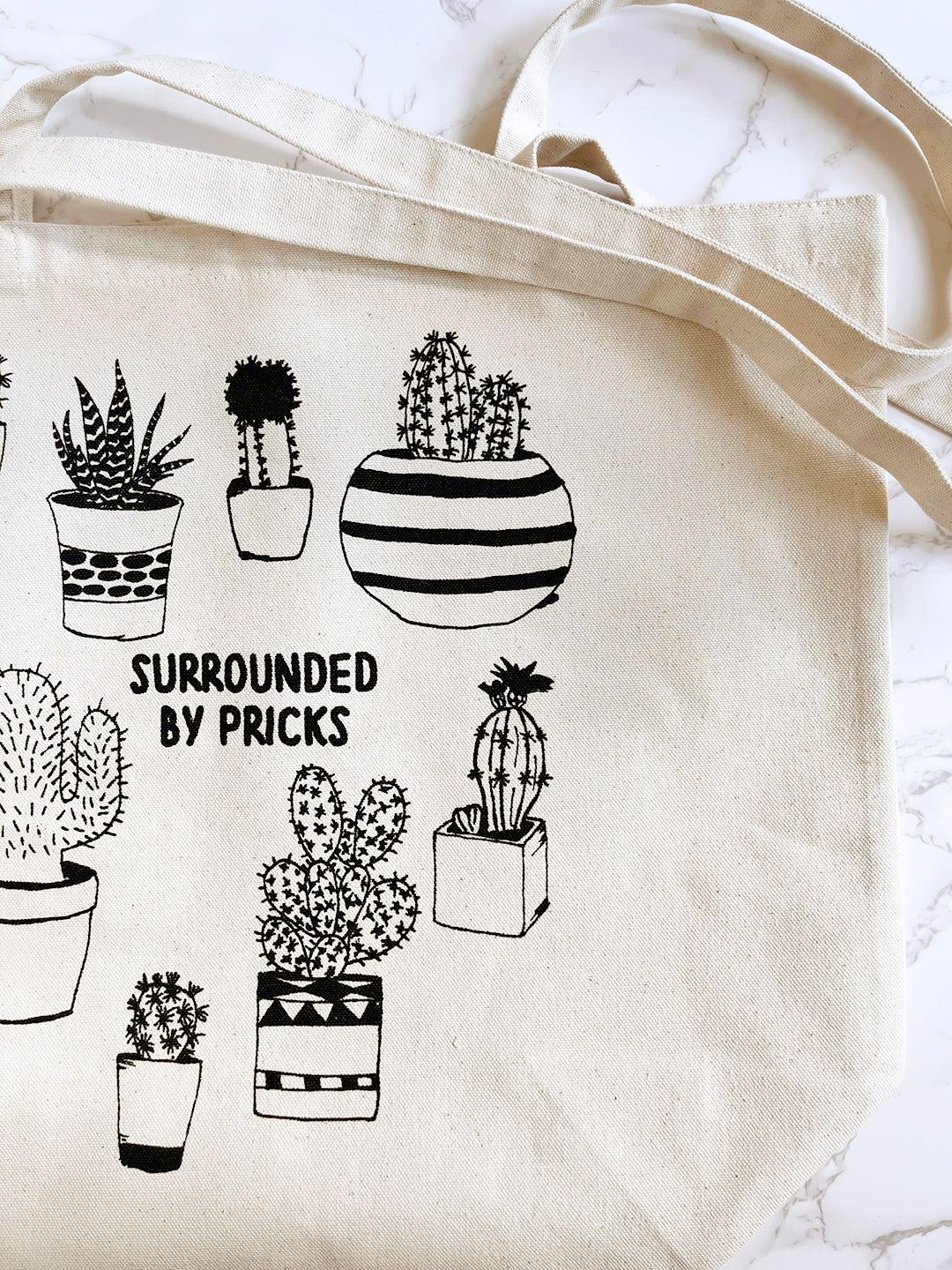 Introducing the Surrounded by Pricks Farmers Market Tote - because don't you just hate it when a prick ruins your grocery shopping trip? Our quirky cotton canvas tote featuring deserty cacti will make sure that doesn't happen! Stylish, practical and reusable, it's the perfect way to show everyone that you don't take yourself too seriously, while still getting your shopping done.