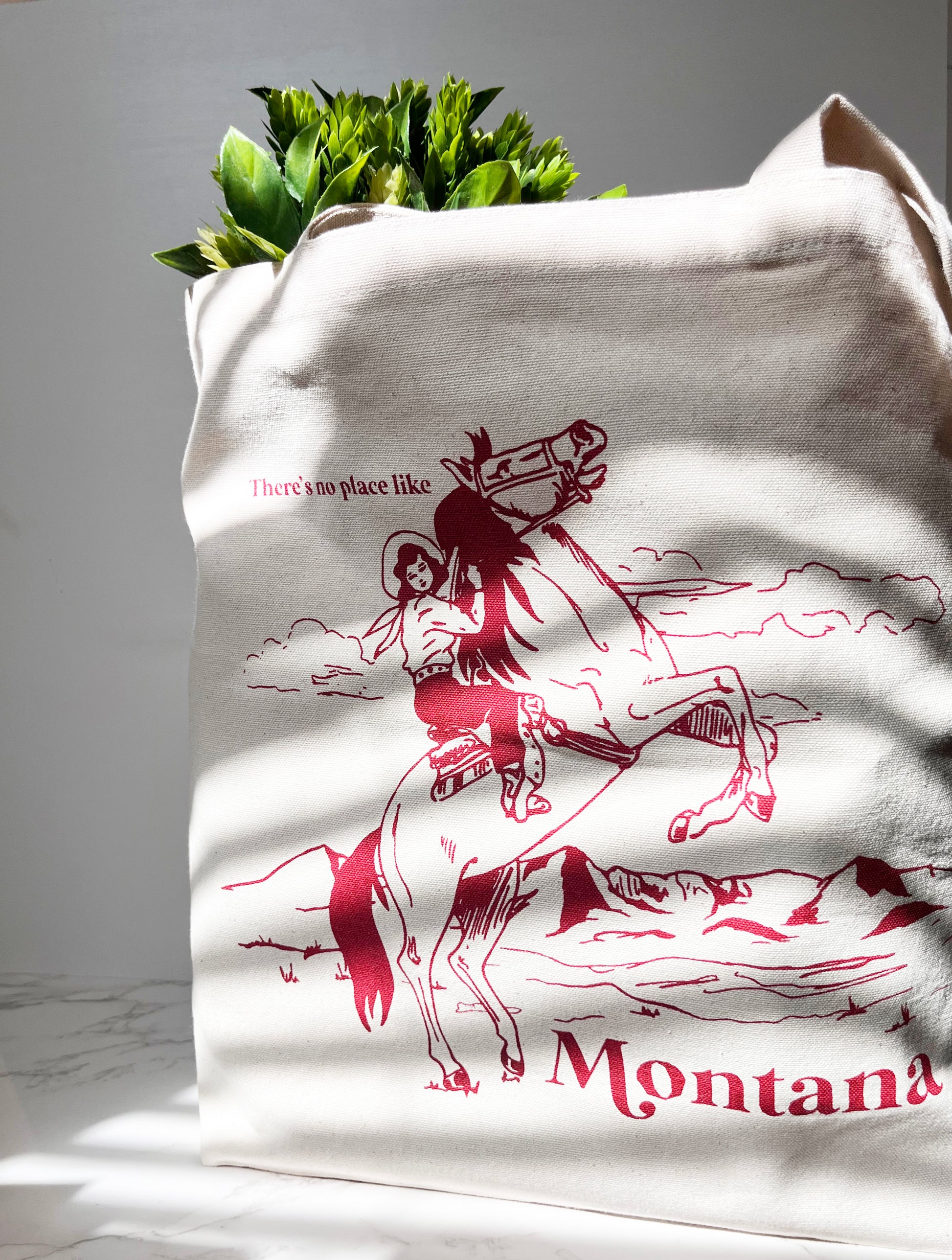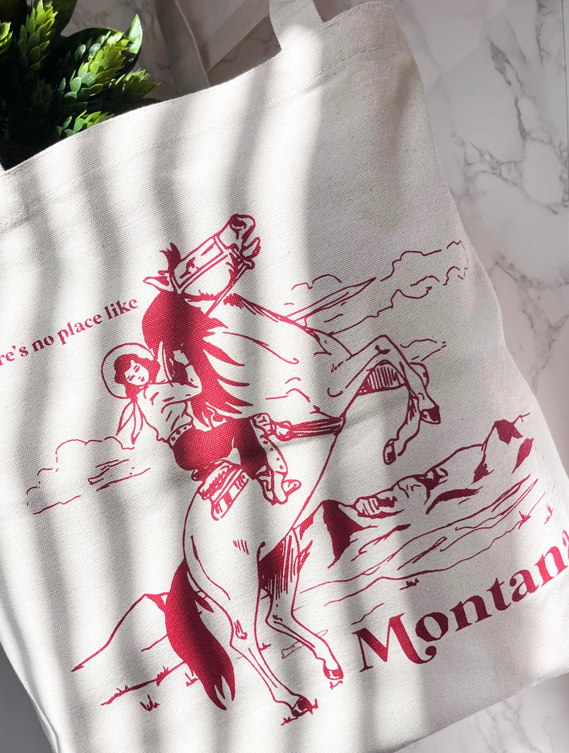 Pack up your troubles and hit the trail with this chic Montana cowgirl tote! Built with a durable, reusable cotton canvas, this bag is perfect for all your shopping needs. Perfect for adventures in the big sky country, this bag proudly declares, “There’s No Place Like Montana!” Yee-haw!