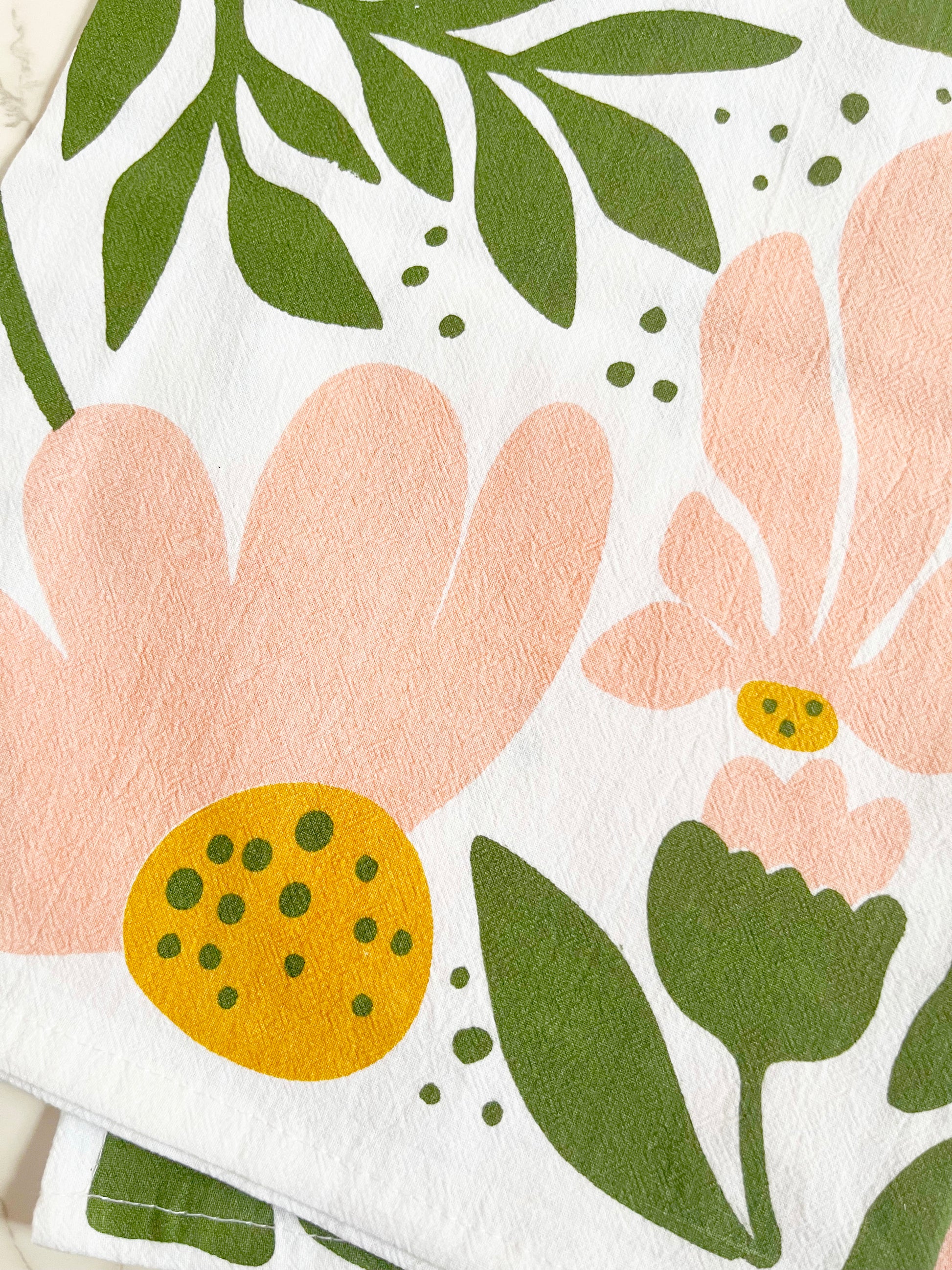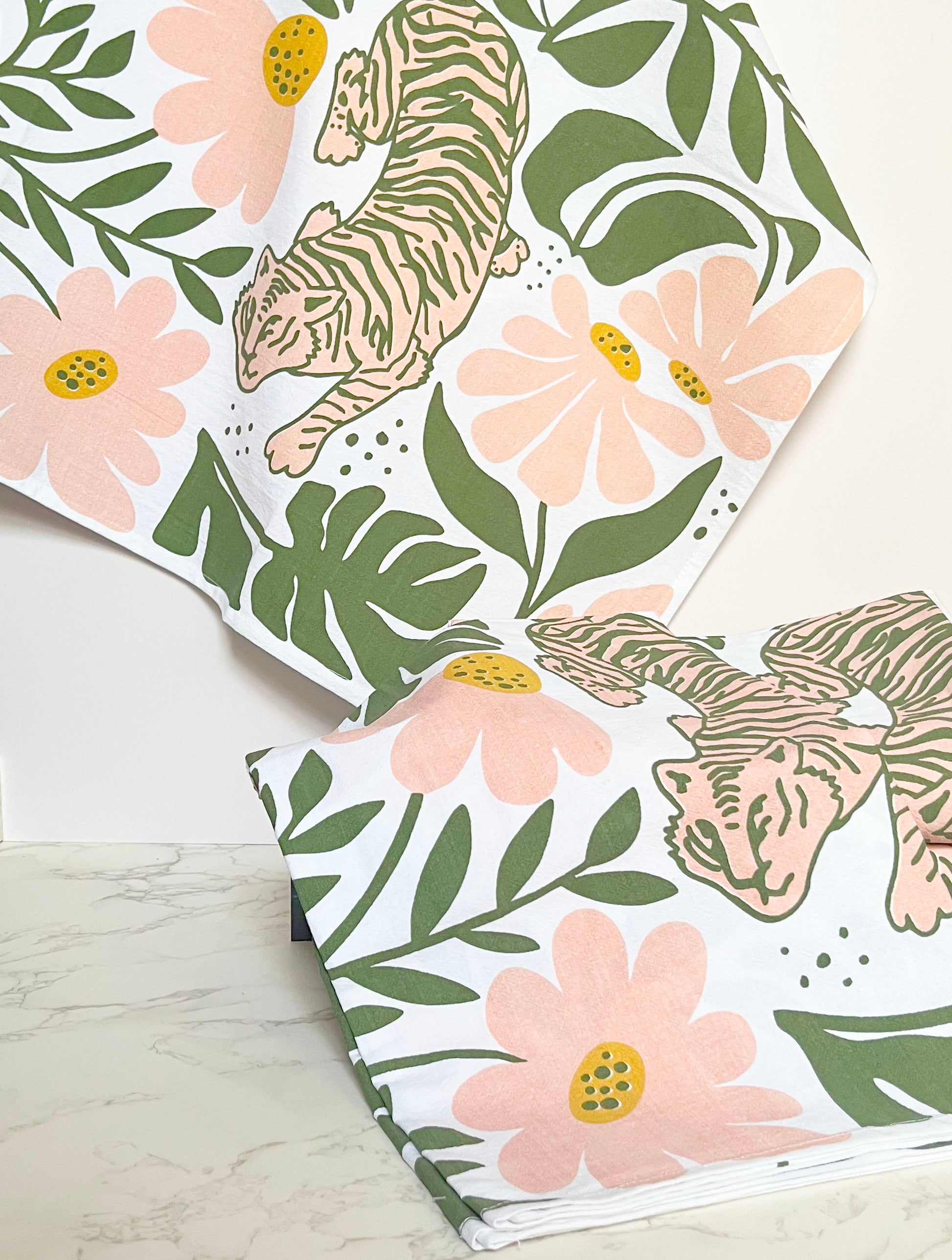 Super cute modern floral tea towel with hand illustrated flowers and a cute tiger. A fun and colorful addition to any kitchen with pinks and greens. Perfect gift for housewarming, Mother's Day, wedding or host! Sweet boho vibes add a splash of color for maximalist style.
