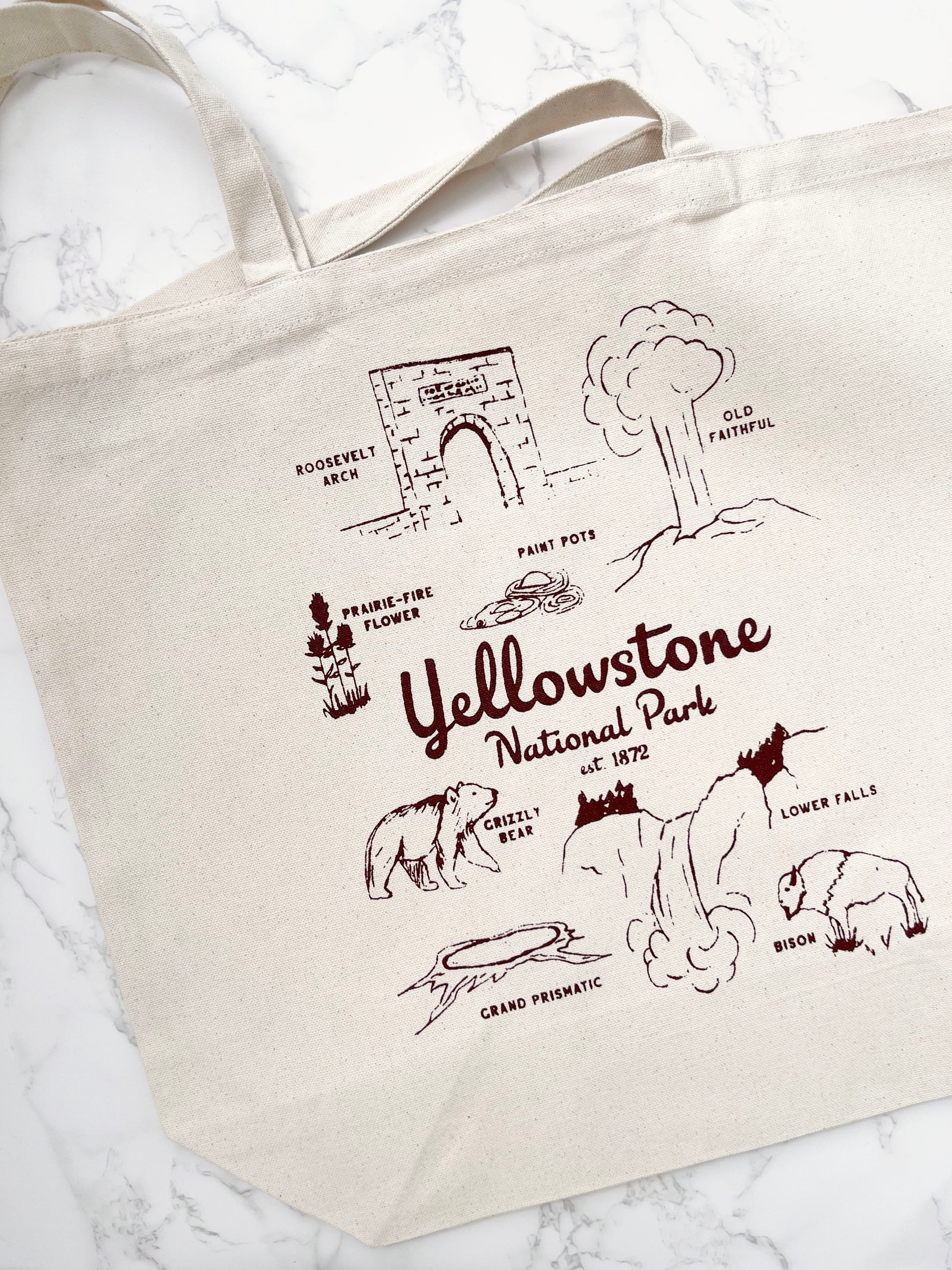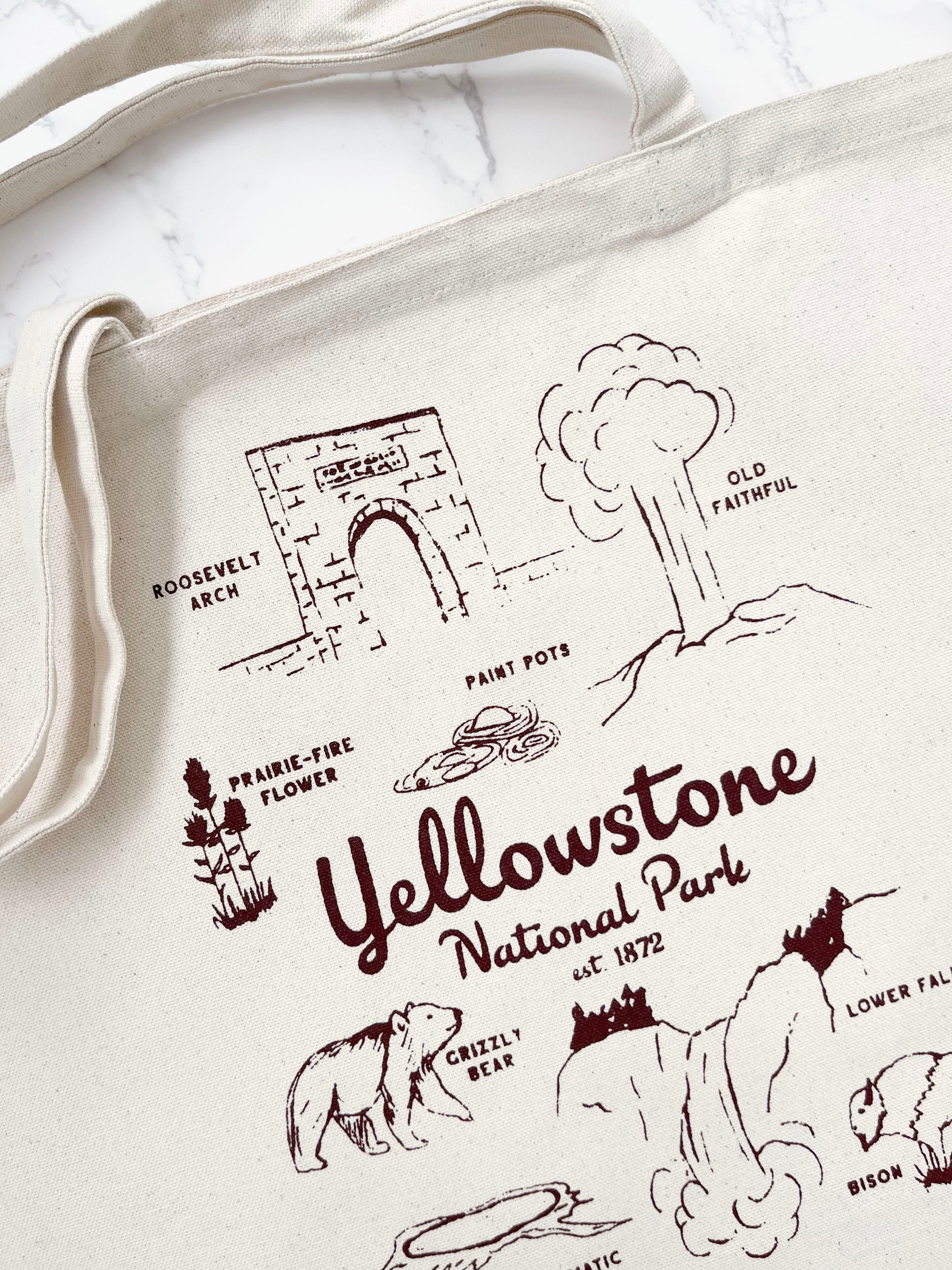 Bring a piece of Yellowstone National Park with you everywhere you go with this reusable cotton canvas tote bag featuring hand screen printed images of geysers, majestic bears, and other iconic features of the park. Its large size and double stitching make it perfect for carrying all of your items, from groceries to gear, with ease and style. Explore the beauty of Yellowstone each day with this timeless and sustainable bag.