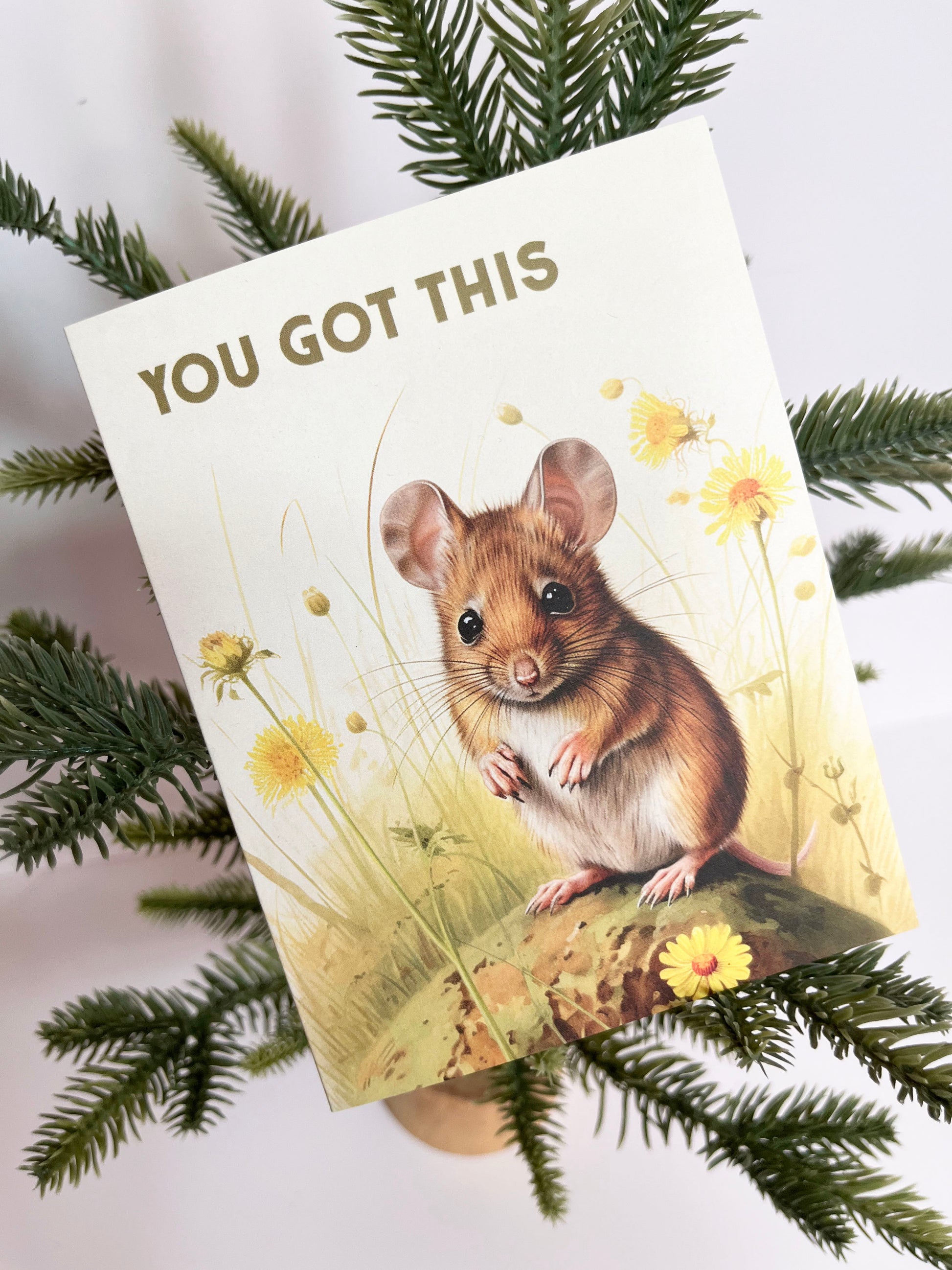 No matter how big the challenge is, your heart is bigger. YOU GOT THIS. Super sweet little vintage field mouse with yellow wildflowers and a great motivational message for anyone facing something scary. Perfect for get well, college graduates, friendship, divorce, sympathy, moving, new parents, or any of the 100542 crazy things life throws at us. This card is so cute you could frame it and put it next to your front door to remind you that you got this!